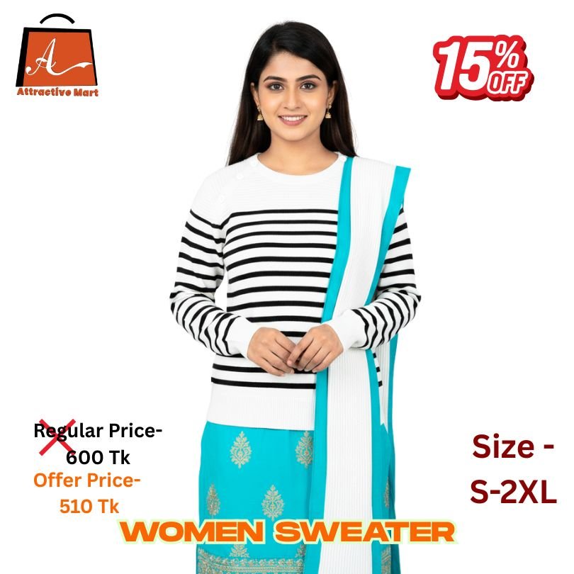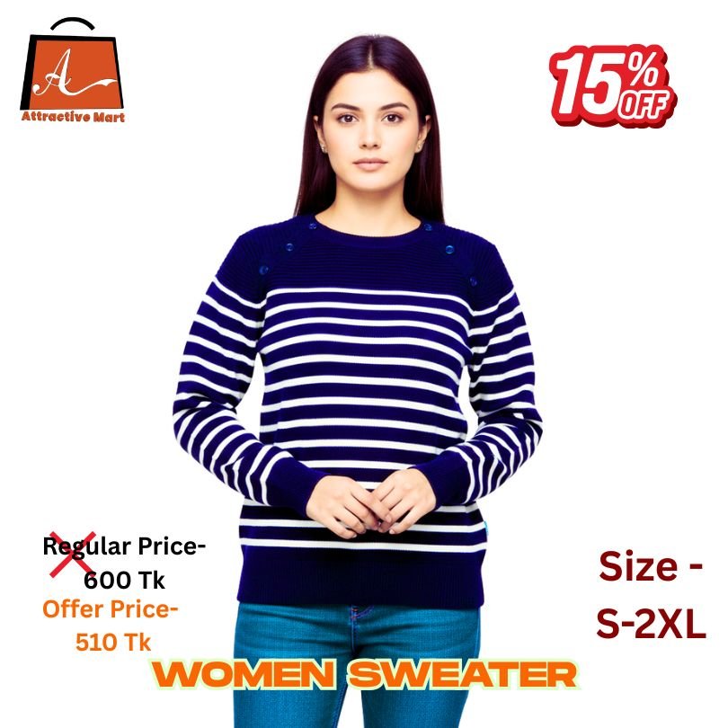 | ১০০% কটন Ladies Sweater – Export Brand, Eco-Friendly ও Stylish – Body cream color with navy blue stripe., Body Navy blue color with cream stripe, S ৳ 1,800.00 Original price was: ৳ 1,800.00.৳ 1,530.00Current price is: ৳ 1,530.00.
